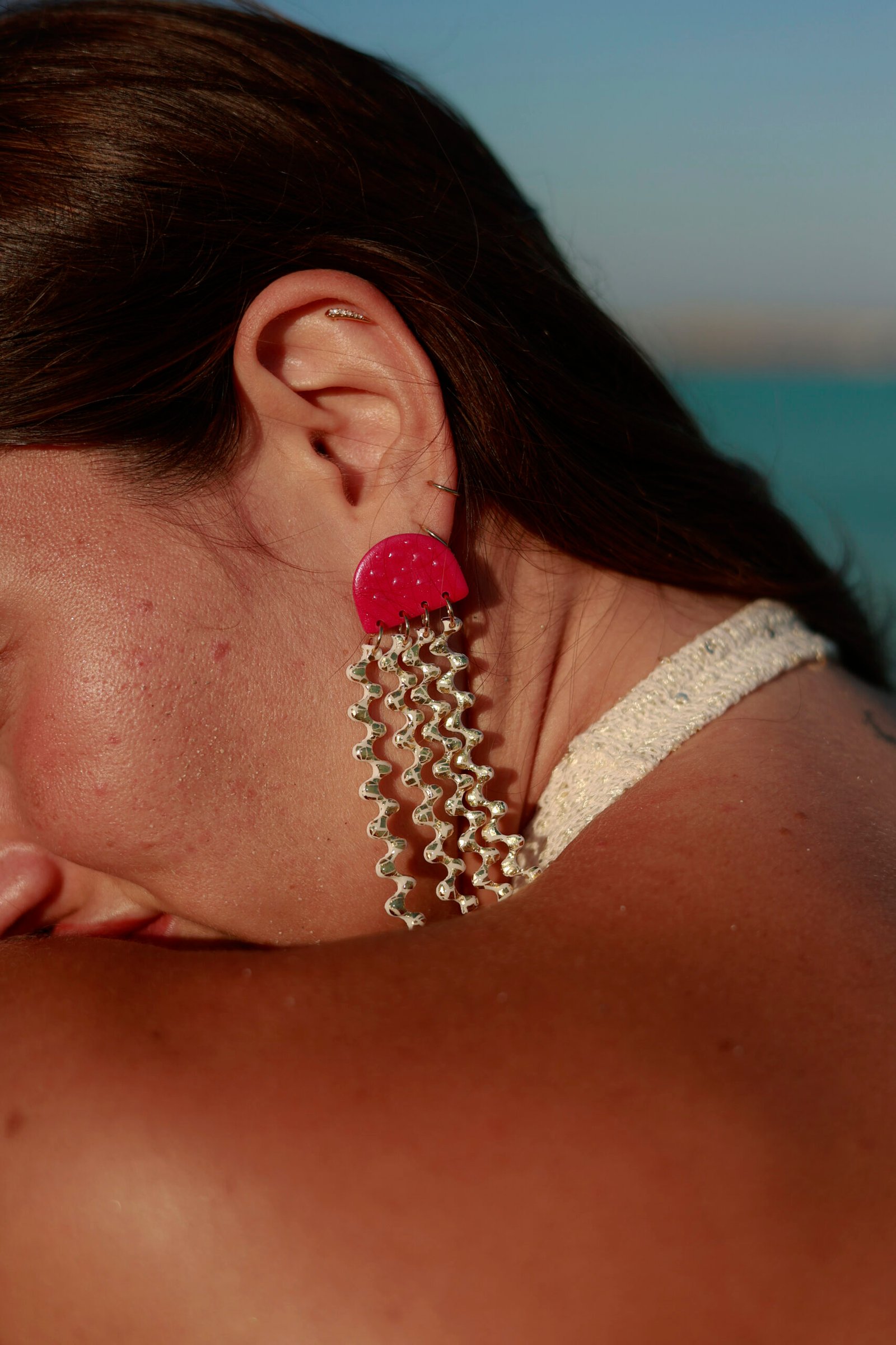 Los Pendientes Medusa están pensados para quienes aman destacar con estilo y personalidad. Su base de resina en color rosa coral se combina con cadenas onduladas tipo serpentina que evocan el movimiento suave de las medusas bajo el mar.